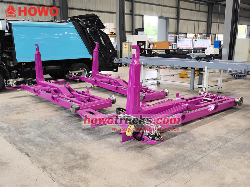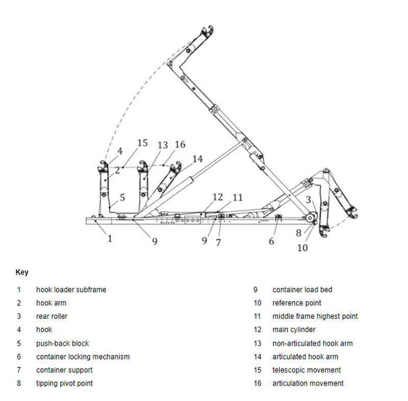 ●Elsősorban egy hidraulikus horogrendszerből, egy kukásegységből, egy reteszelőeszközből és egy működési vezérlőrendszerből áll. A hidraulikus horog lehetővé teszi a jármű számára a hulladékgyűjtők gyors be- és kirakodását, lehetővé téve az „egy jármű, több kukás” ciklust, jelentősen javítva a hulladékgyűjtés és -szállítás hatékonyságát, valamint csökkentve az üzemeltetési költségeket.