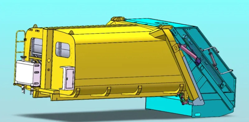 1. A szemetet a hátsó billentő mechanizmuson keresztül a felsőtest rakodónyílásába vezetik, majd egy toló vagy kaparó segítségével a kompressziós tartályba tolják.