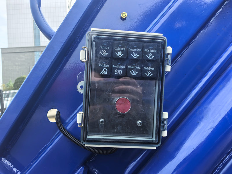 A fülkében található vezérlődoboz vezérelheti a tolást és kirakodást, valamint kiválaszthatja az üzemmódot (például automatikus vagy manuális), a jármű hátulján található vezérlődoboz pedig a préselési és töltőmechanizmus, valamint a hordófordító mechanizmus működését vezérli. Használata és működtetése nagyon kényelmes. Különösen hulladéklerakókban a kezelők a járműről való leszállás nélkül is elvégezhetik a kirakodást és a szennyvízürítést. A vezetékes távirányító eszközök a felhasználói igényeknek megfelelően telepíthetők.