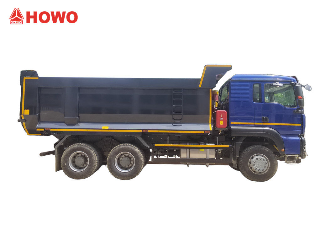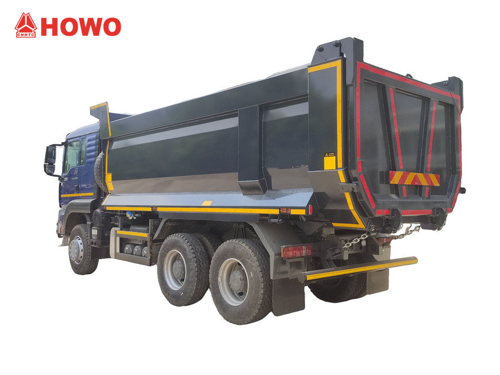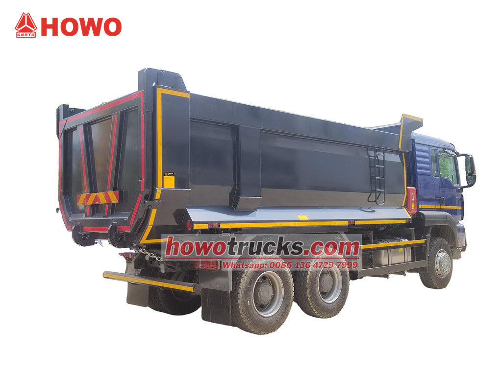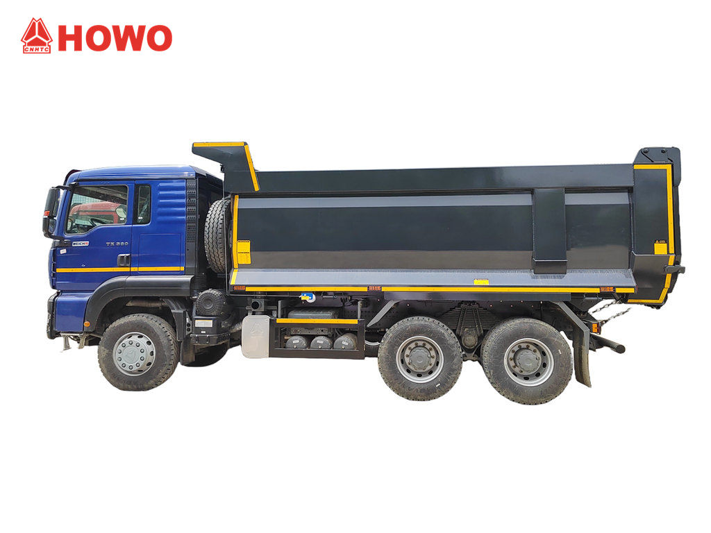 A HOWO TX kabinos dömper teherautó a HOWO TX kabinos 6x4 alváz alapján lett átalakítva, 3200+1400 mm tengelytávval, 380 lóerős WP10.380E22 dízelmotorral, HW19710 sebességváltóval, 10 előremeneti, 2 hátrameneti fokozattal és szénacélból készült dömperrel, oldalvastagsága 6 mm, alja vastagsága 8 mm. 5200x2300x1400mm, Elülső felső emelés, stabil emelés, tiszta és gyors kirakodás, a hátsó ajtók nyithatók, a járművet a vezetőoldalon található vezérlőszelep vezérli, amely könnyen kezelhető.