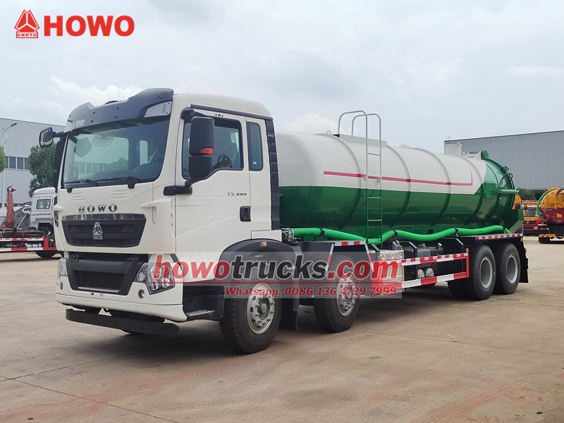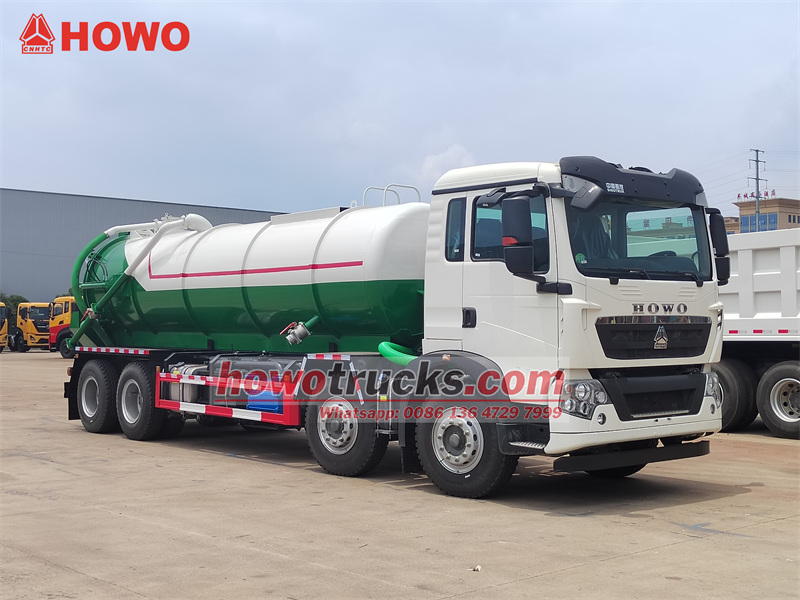 17500A HOWO TX 25000L vákuumszállító tartálykocsi egy speciális szaniter jármű, amelyet folyékony hulladék és iszap hatékony szívására, szállítására és ártalmatlanítására terveztek. Egy HOWO TX 8×4 nagy teherbírású alvázra épül, egy 350 lóerős motorral és egy HW19710 10 sebességes sebességváltóval, valamint egy nagy, 400 literes üzemanyagtartállyal rendelkezik. A felépítmény egy 25 köbméteres, 6 mm-es, kiváló minőségű szénacélból készült vákuumtartályt tartalmaz, amely egy SK-20 vízgyűrűs vákuumszivattyúval van integrálva, amely maximálisan 20 m³/perc szívási sebességet és 8300 Pa vákuumszintet képes elérni, biztosítva az erős szívást és a korrózióállóságot.