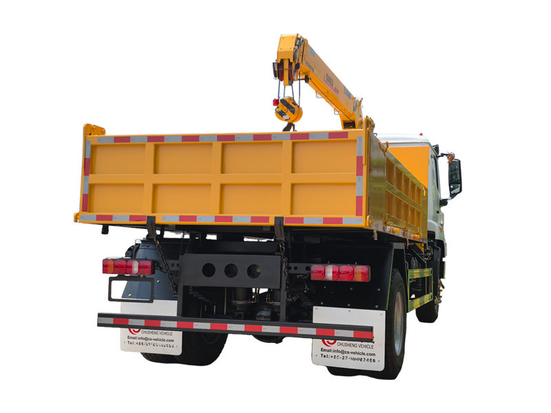 A SINOTRUK HOWO dömperautóra szerelhető daru egy sokoldalú mérnöki jármű, amely emelési és önürítési funkciókat is magában foglal. Nagy szilárdságú U-alakú gémmel és rakománytároló emelőrendszerrel felszerelve 360°-ban forgó emelési műveleteket, valamint anyagürítést is képes végrehajtani. Maximális 4 tonna emelőkapacitásával és maximális 10 méteres emelési magasságával különféle helyzetekben, például építkezéseken és raktárakban is használható. Túlterhelés elleni védelemmel és széles fesztávolságú kitámasztókarokkal tervezték, így biztonságos és hatékony működést biztosít.